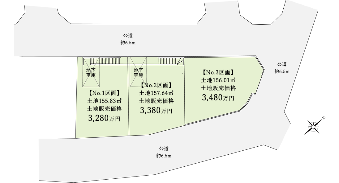 3区画ともに155㎡以上の広々とした敷地面積となっており、