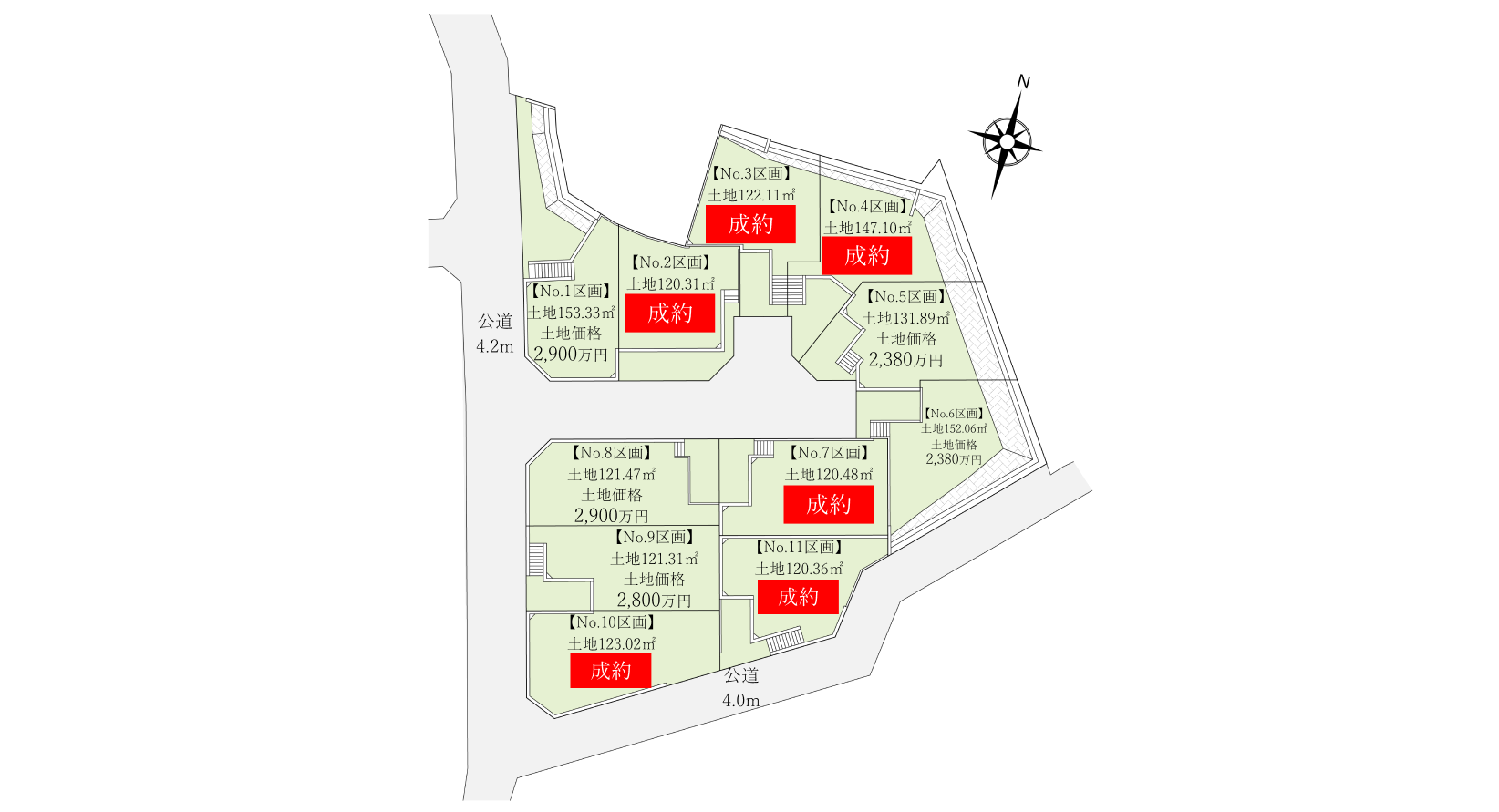 当分譲地は前面道路からの目線を気にすることなく、リビングを配置頂けるプライベート空間の確保がし易い、区画配置となります。