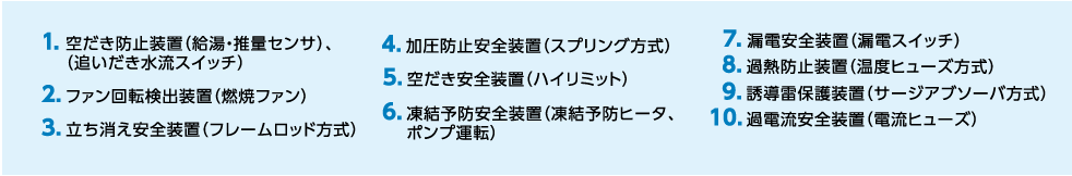 | 3.立消え安全装置(フレームロッド方式) | 6.凍結予防安全装置(凍結予防ヒーター、ポンプ運転) | 9.過電流安全置(電流ヒューズ |
