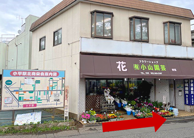 北口下り、「小山園芸」前を右に曲がり直進します。