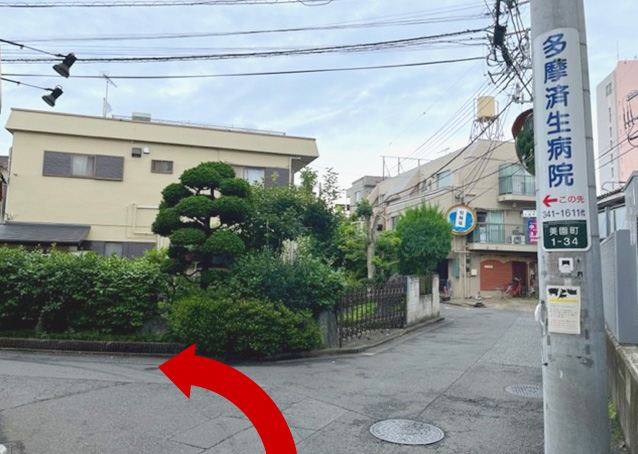 右側に「多摩済生病院」電柱看板が見えたら、左側に曲がります。