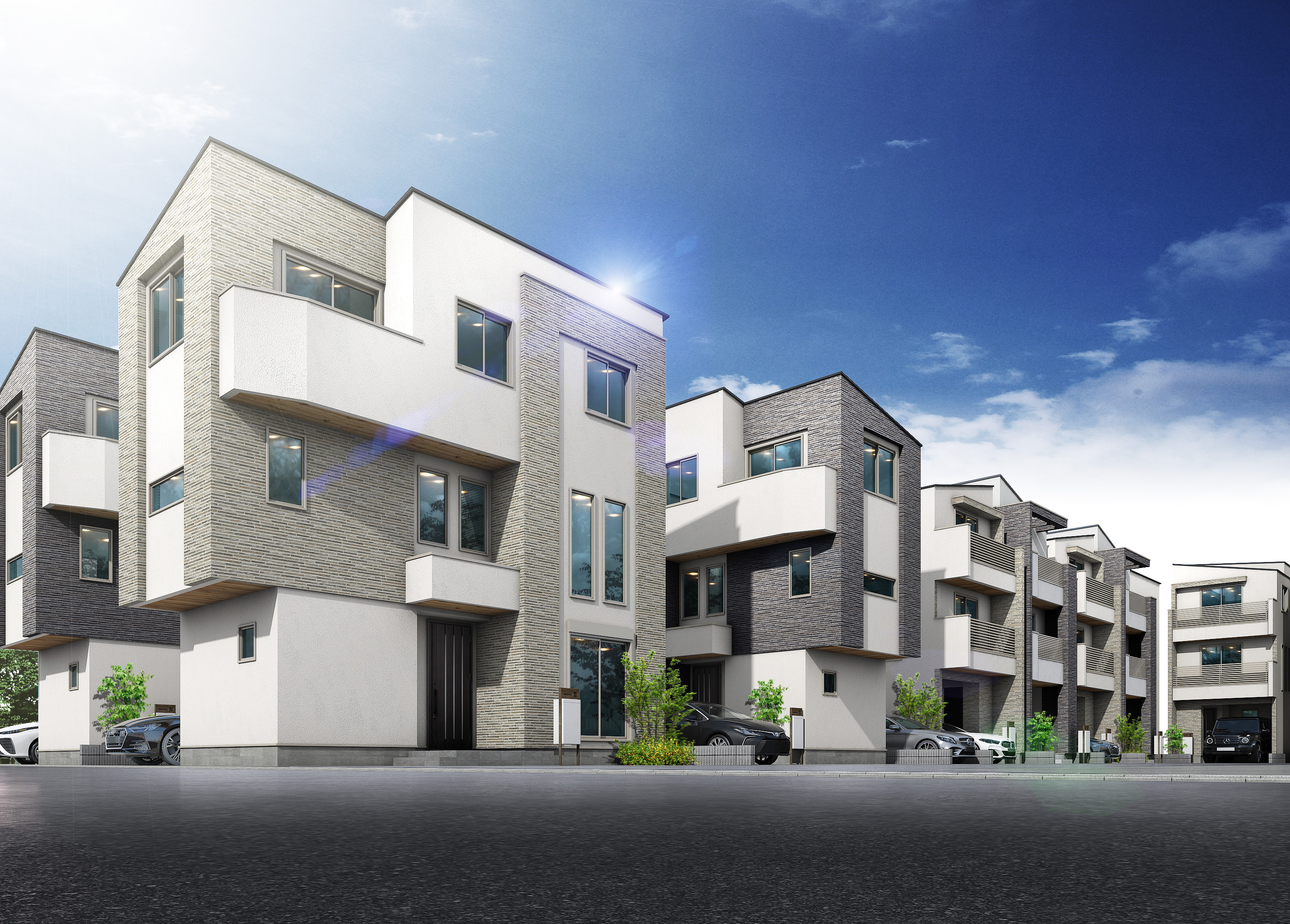 前面道路の広さが街区内の空間的な開放感を演出します。